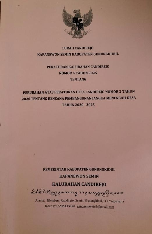 Peraturan Kalurahan Candirejo Nomor 4 Tahun 2025 Tentang Perubahan Atas Peraturan Desa Candirejo Nomor 2 Tahun 2020 Tentang Rencana Pembangunan Jnagka Menengah Desa Tahun 2020-2025