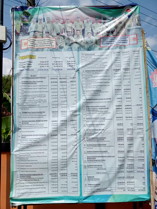 Candirejo, 4 Februari 2026 (SIDA) Sebagai salah satu bentuk Transparansi Publik tentang APBKal Tahun 2026 dan Laporan Pertanggungjawaban Realisasi Pelaksanaan APBKal 2025, di pandang perlu memasang banner tentang Ringkasan APBKal Tahun 2026 dan memasang banner Laporan Pertanggungjawaban Realisasi Pelaksanaan APBKal 2025 di Kalurahan Candirejo, Kapanewon Semin, Kabupaten Gunungkidul. Banner Transparansi ini terpasang di sebelah barat Balai Kalurahan Candirejo dan PAUD Daya Ananda II Candirejo.